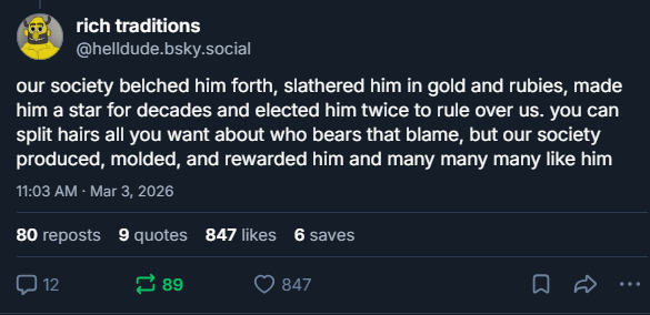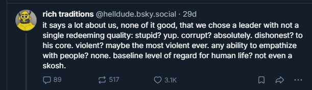 I bring all this up because we're living through the unending nightmare of it all. And I've been thinking about this post about Trump by hall of fame poster The Helldude. Like the best of microblogging, it condenses something I wanted to write in longer form.